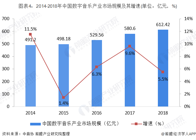 2018年中国数字音乐产业规模达到612.42亿元,同比增长5.5%。数字音乐用户规模超过5.5亿人,同比增长5.1%,用户增量红利进入尾声,存量用户消费市场成为未来主要增长点。