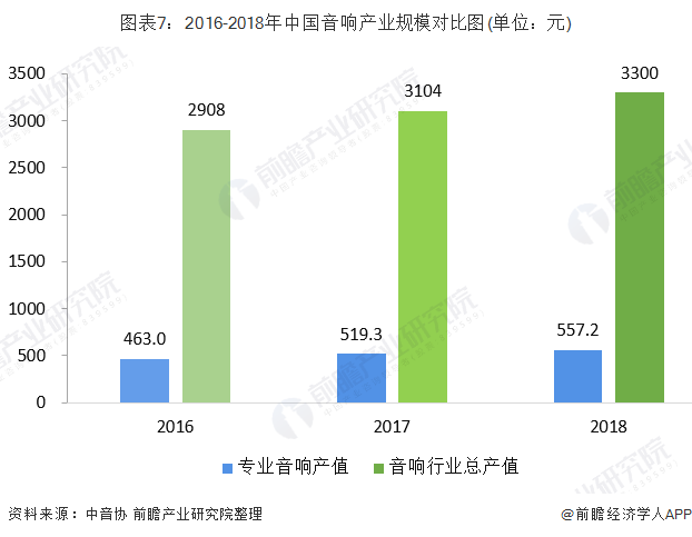 2018年我国主要电子音响产品总产值约为3300亿元,同比增长6.3%。其中与音乐产业制作、传播和欣赏密切相关的专业音响总值达557.2亿元,同比增长7.2%。