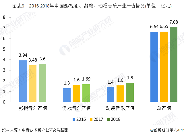 2018年影视剧、游戏、动漫音乐产业总产值达7.08亿元,同比增长6.47%。其中影视剧音乐产业总值约为3.6亿元,同比增长3.45%;游戏音乐收入约1.69亿元,同比增长5.63%;动漫音乐收入约1.79亿元,同比增长14.01%。
