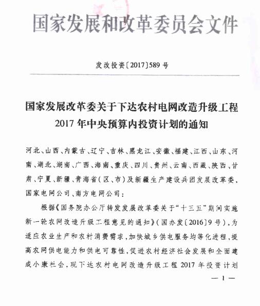 发改委下达农村电网改造升级工程2017年投资计划