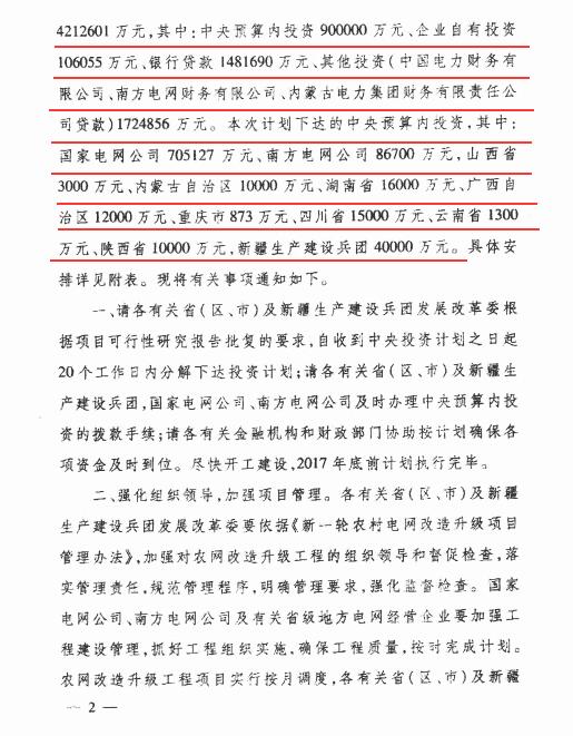 国家发改委下达新疆兵团2017年农网改造升级工程资金