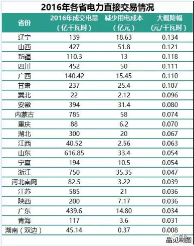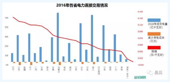 为了纪念直购电,更多的是为了探索市场化交易,晶见工作室整理了部份省份在2016年进行的电力直接交易的成交电量和用户降低的用电成本,以及对应的降价幅度。