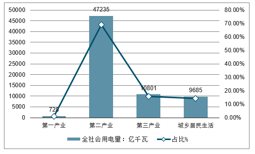 2018年中国全社会用电量产业分布情况(单位:亿千瓦时,%)