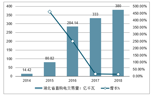 以湖北省为例,数据显示,2017年湖北省直购电交易量333亿千瓦时(度),占全省全部工业用电量的28%。2018年,直购电交易量将超过380亿千瓦时,同比去年增长14%;参与直接交易的企业达1140家,同比增长约3.83倍,相关企业共节省电费支出约5.2亿元。