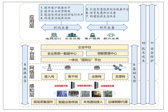 在建设内容方面,国家电网泛在电力物联网建设围绕对内业务、对外业务、数据共享、基础支撑、技术攻关和安全防护6大领域的11个重点建设方向,由感知层、网络层、平台层和应用层四层技术架构承载。