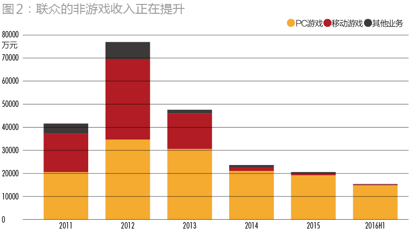 2016年4月,联众发布集团LOGO,并首次披露游戏、电子竞技、中国智力体育、全球竞技娱乐及体育电商五大平台发展战略,从“棋牌游戏公司”向“体育娱乐平台型公司”蜕变。从公司财报看,作为联众整个业务发展的基础和入口,游戏平台保持稳健增长。同时,转型成果也已初显—2015年上半年非游戏收入几乎可忽略不计,下半年开始大力推进,至2016年上半年该业务收入已达4398万元,占集团整体收入份额首次超过10%,平台收入结构优化开始初现成果(图2)。