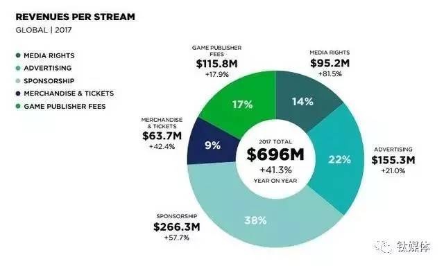 市场研究公司Newzoo在日前公布的《全球电子竞技市场报告》中预计,2017年全球电竞市场规模将同比增长41.3%,达6.96亿美元,收入来自品牌运营(赞助、广告和媒体转播权)、门票和周边,以及游戏发行商的投资。品牌预计将花费5.17亿美元,其中1.55亿美元为广告,2.66亿美元为赞助,还有9500万美元为媒体版权。品牌在电竞方面的投资将于2020年翻一番,推动市场总值达到15亿美元。消费者在门票和商品方面的支出将达到6300万美元。