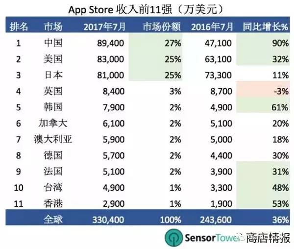 在此次Sensor Tower监测到的数据当中,2017年7月App Store全球总营收超过33亿美元,中国、美国、日本前三市场贡献占比分别为27%、25%、25%。其中,中国市场以8.94亿美元收入领跑,且同比增长率惊人,达到90%之多。