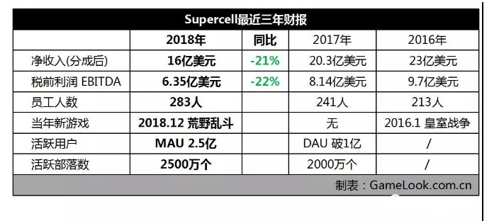数据显示2018年Supercell公司净收入达16亿美元同比减少21%、EBITDA税前利润为6.35亿美元同比减少22%,截至2018年底Supercell员工人数为283人。