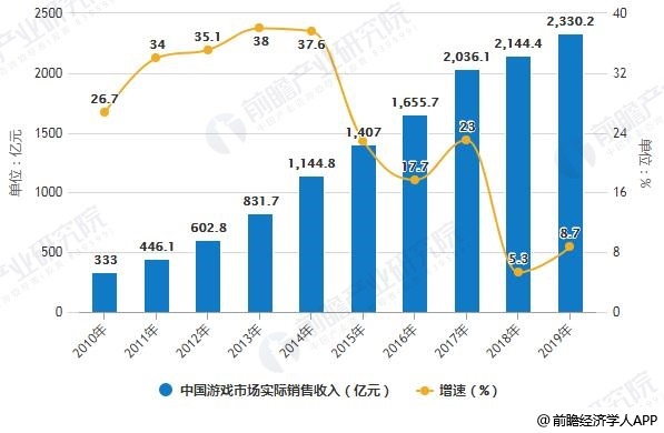 2010-2019年中国游戏市场实际销售收入统计及增长情况