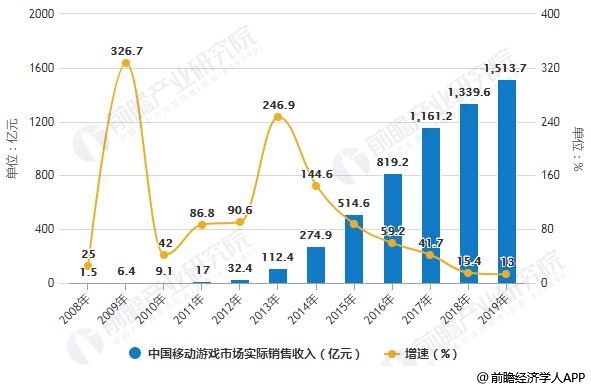 根据伽马数据,2019年中国移动游戏市场实际销售收入达到1513.7亿元,较去年同比增长13.0%,继续保持增长势头,中国移动游戏市场将逐渐进入稳定增长阶段。