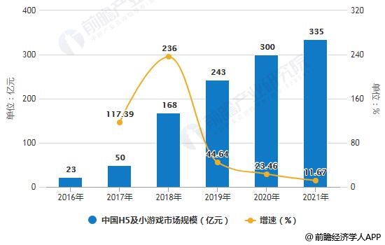 根据易观数据,2018年中国H5及小游戏市场规模达到168亿元,预计到2021年这一数字将达到335亿元。