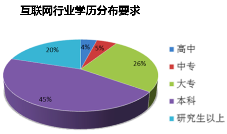 通过对互联网从业者进行调查发现,本科学历的人群占比达到45%,成为该行业的主要从业群体。该行业整体学历水准较高,也与互联网属于高科技行业密不可分,尤其是大量的计算机学校为该行业输入大量的技术人才。