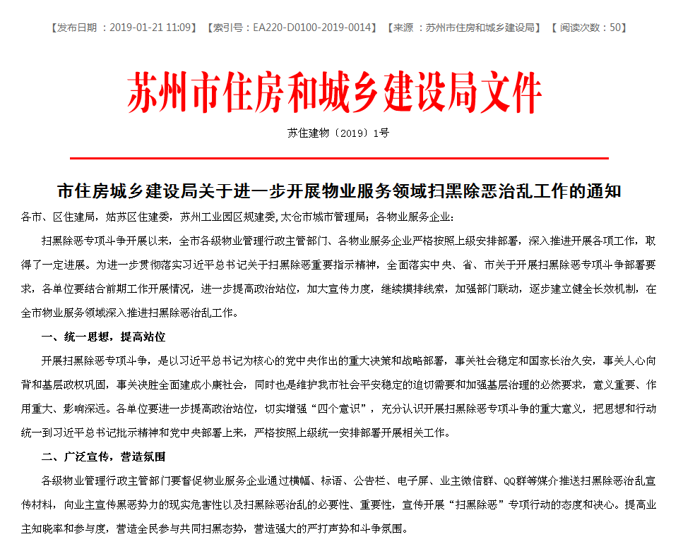1月21日,苏州市市住房城乡建设局发布关于进一步开展物业服务领域扫黑除恶治乱工作的通知。