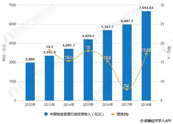2018年,中国物业管理行业经营收入为7043.63亿元,同比增长17.25%;管理物业总面积达279.3亿平方米,同比增长13.2%;从业人口接近1000万人。总体上,我国物业管理行业发展呈现不断提升的态势。