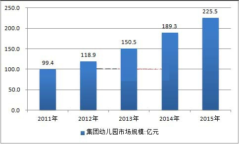 2015年我国集团幼儿园行业市场规模约225.5亿元,同比2014年的189.3亿元增长了19.12%,近几年我国集团幼儿园行业市场规模情况如下图所示:
