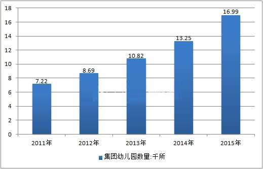 博思数据发布的《2017-2022年中国集团幼儿园行业市场分析与投资前景研究报告》,2015年我国集团幼儿园总量达到了16.99千所,同比2014年的13.25千所增长了28.23%,近几年我国集团幼儿园数量增速超过了25%,如下图所示: