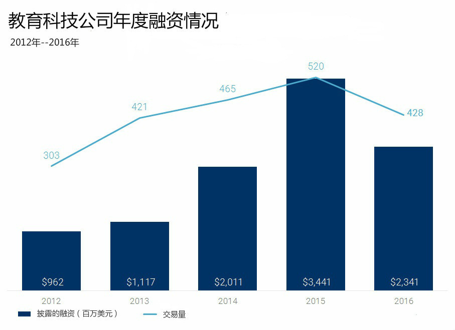 2012至2015年,教育科技创业公司所获投资额每年都有增长。在此时期内,同行业所获的美元投资涨幅超过250%,交易数量涨幅也达72%之高。然而,2016年美元投资和交易数量却有下降,较2015年分别下挫约32%和18%。