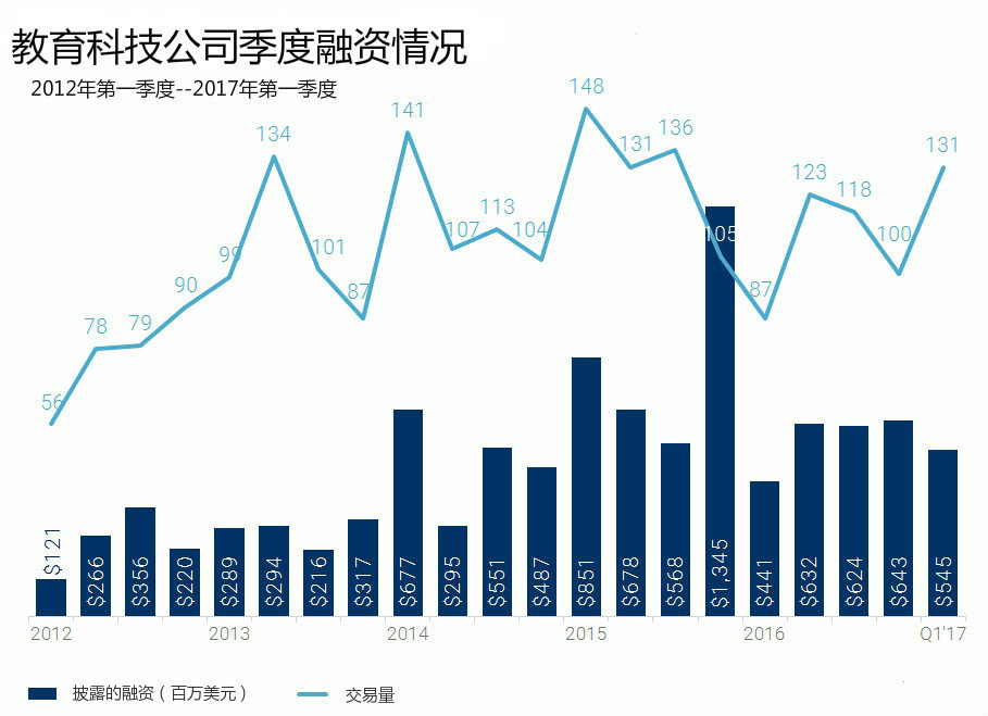 2017年第一季度,教育科技创业公司吸引了131笔资金,总额约为5.45亿美元,与前五个季度相比,交易量有所上涨。但2017年第一季度的融资金额仍远低于2015年第四季度和2016年前三个季度。在2015年第四季度,该行业的融资总额达到峰值。