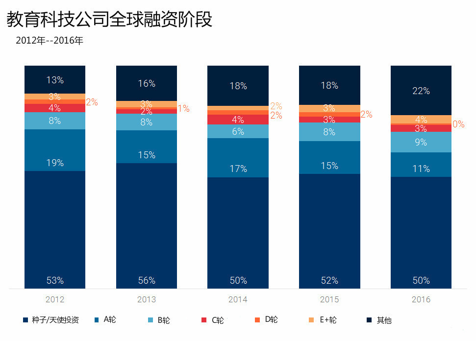 在过去五年中,教育科技行业已累积了大部分的初始资金。事实上,自2012年以来,每年都有超过50%的种子/天使资金都流入这一行业。总体而言,交易份额分配相对稳定,而其他方面则出现剧烈变化,例如:可转换票据和公司少数股权投资从2012年的13%上涨到2016年的22%。