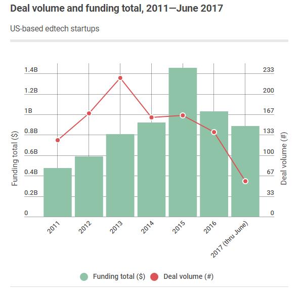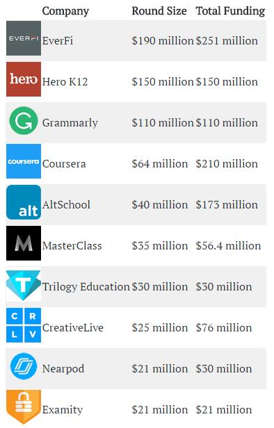 在2017年上半年的8.87亿美元总投资中,有其中三笔规模较大的投资占了总额的大多数。这三笔投资是EverFi(1.9亿美元)、Hero K12(1.5亿美元)和Grammarly(1.1亿美元)。仅仅就这三笔投资总额就占今年上半年投资投资额的一半以上。