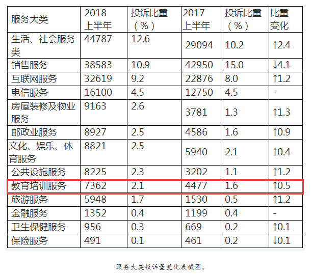 近日,中国消费者协会又公布了《2018年上半年全国消协组织受理投诉情况分析》,分析显示2018年上半年教育培训服务投诉量7362件,比2017同期增加了64%。