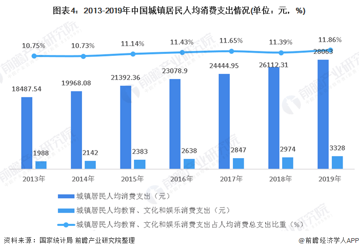 据国家统计局统计,2013-2018年,我国城镇居民人均消费支出逐年增长,其中人均教育、文化和娱乐消费支出占人均消费总支出的比重保持在10%-12%之间,反映我国城镇居民教育、文化和娱乐消费支出在消费结构中占比较稳定。2019年,我国城镇居民人均消费支出达到28063元,其中人均教育、文化和娱乐消费支出3328元,占比达到11.86%。