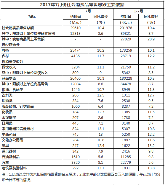 国际在线报道:据国家统计局网站消息,2017年7月份,社会消费品零售总额29610亿元,同比名义增长10.4%(扣除价格因素实际增长9.6%,以下除特殊说明外均为名义增长)。其中,限额以上单位消费品零售额12813亿元,增长8.6%。