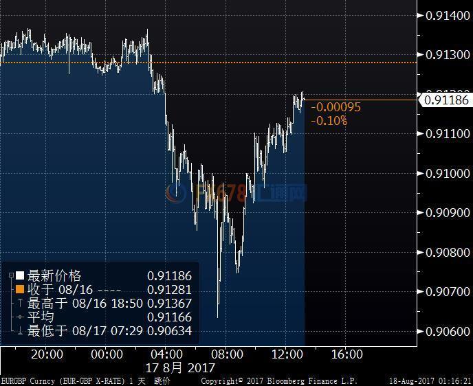 英镑兑欧元周四(8月17日)升至略高于0.91的水准,此前英国公布的零售销售数据好坏不一,帮助投资者暂时放下对经济和脱欧谈判的担忧,此前英镑受累跌至10月以来的最低水准。