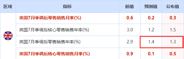 英国7月零售销售按月增幅略微好于预期,但同比增幅却降至1.3%,预估为增长1.4%。6月修正后为增长2.8%。