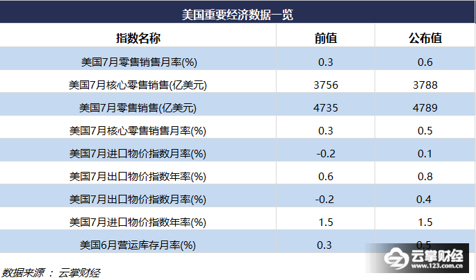美国7月零售销售月率增幅创七个月最大