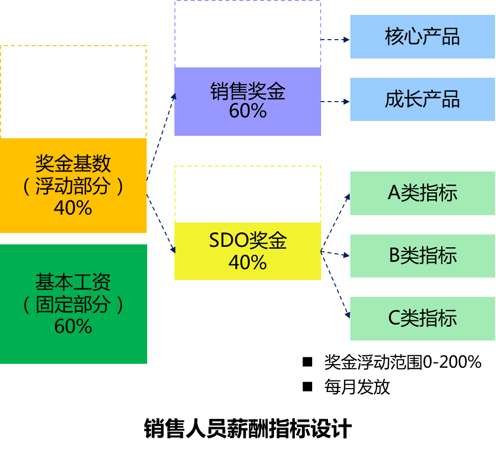 快速消费品行业销售人员的薪酬考核指标设计要避免太复杂,多关注核心产品,设置核心指标,简化考核项目,使考核项目尽量量化并易于理解。例如将销售人员的薪酬按6:4的比例分为基本工资和奖金两部分,奖金部分分为销售奖金和SDO奖金(销售目标奖金),销售奖金占60% 的比例,销售产品由核心产品和成长产品为主,突出销售人员以销售产品为主的特点,同时避免了产品种类过多,项目不易考核的情况。SDO奖金占比例为40%,以测量销售人员的其他能力,包括工作能力指标、工作态度指标等,这类指标还可以进一步细分为专业知识、人际沟通能力、合作能力、责任心、成本意识等指标。