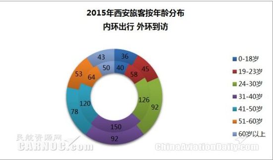 长安航空品牌形象与营销宣传更应注重年轻人的认同,鲜明的色彩与充满活力的品牌形象非常重要。纵观亚太成熟的低成本航空公司,品牌形象将直接决定直销比例与旅客的关注程度。低成本航空提供最基础的运输服务,因此票价相对较低,对以私人消费为主的多数旅客及价格敏感的旅客更具吸引力,特别是对年轻群体具有广泛吸引力。对整个西安航空市场而言,以2015年中航信航指数对西安旅客按年龄分布为例,通过证件识别每个曾乘坐飞机的旅客,以西安作为最常出发地的旅客视为西安的出行人群。以西安以外其他城市作为最常出发地的旅客视为西安到访人群,无论到访人群还是西安出行人群,40岁以下旅客超过60%,由此可见针对年轻群体品牌营销的重要意义。