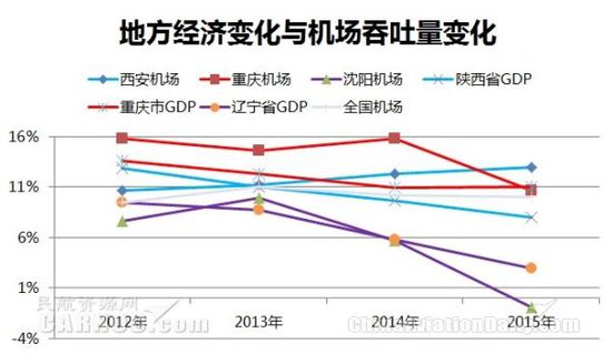 对比西安、重庆、沈阳三座机场近年来旅客吞吐量的变化同当地经济发展的变化,不难观察到地方经济发展与机场旅客吞吐量的变化存在一定联系。在陕西经济发展的带动下西安航空市场近年来仍保持高速发展,连续多年高于全国机场旅客吞吐量平均增长速度。从地方经济发展的角度观察,西安航空市场仍会保持中高速增长。