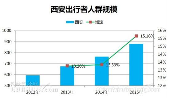 通过证件唯一识别城市离港旅客人群,对每个曾乘坐飞机的旅客作为一个个体。以该城市作为最常出发地的旅客视为该市的出行者,从出行人群角度观察,西安的出行人群仍处于较高速的增长阶段,市场仍有增长的潜力。长安航空作为低成本航空利用机票价格优势刺激市场中潜在需求,亦将保证机队规模快速扩大。