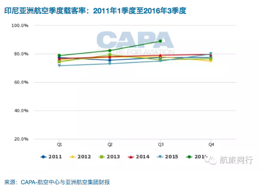印尼亚洲航空季度载客率:2011年1季度至2016年3季度