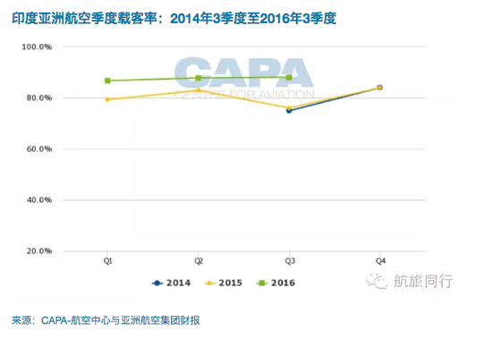 印度亚洲航空季度载客率:2014年3季度至2016年3季度