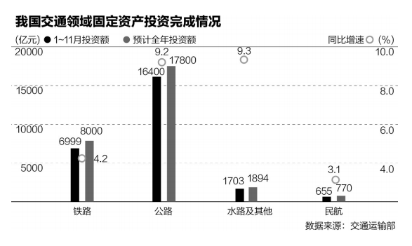 综合运输要积厚成势,一个关键是加大交通基础设施的投资力度。今年1~11月,我国铁路、公路、水路、民航固定资产投资已完成2.57万亿元,同比增长7.7%。