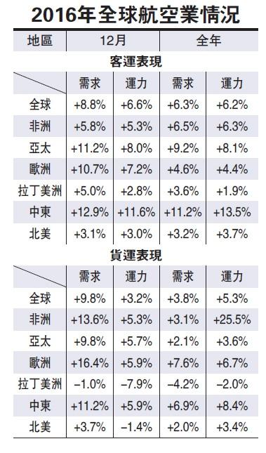 年内,国际航线客运量升6.7%,运力增长6.9%,各区域的航空公司国际航线需求均实现增长。国内航线方面,去年客运需求升5.7%,运力增长5.1%。除了巴西市场,其他区域航空公司均实现增长,印度和中国国内航线需求升幅更分别达23.3%和11.7%。去年12月,全球航空客运需求增长8.8%,运力升6.6%。