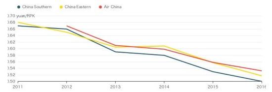 2012年,东航的每公里每吨客运或货运成本要比南航和国航分别高出0.9%和6.1%左右。2016年,东航的这一成本要比南航和国航分别高出8.1%和14%。