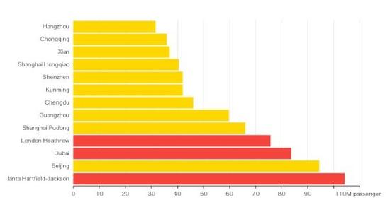 深度解析:中国三大航谁被低估 谁将胜出?资料图:中国主要机场客运量与全球几大机场的对比情况