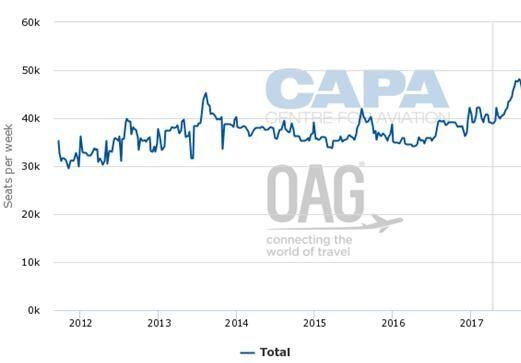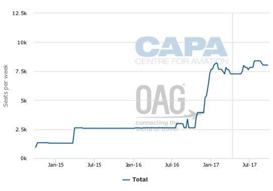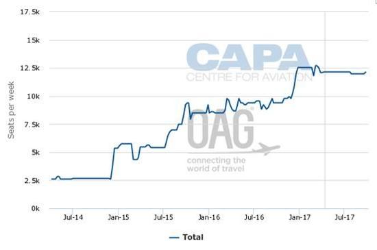 亚洲低成本航空抢占美国海岛市场分析资料图:2014年4月-2017年6月 塞班市场LCC单程周运力情况。图片来自CAPA