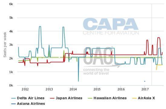 亚洲低成本航空抢占美国海岛市场分析资料图:2011年9月-2017年9月间日本至火奴鲁鲁单程运力情况。图片来自CAPA