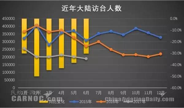 笔者曾在2015年10月《2016两岸关系或将变化 航空公司需及早应对》一文中曾对两岸的航空公司做出建议,需为未来可能的变化提前做好两手准备。2016年两岸关系的确发生了较大的变化,时至今日仍无恢复的迹象。从2016年5月至今,大陆赴台人数持续14个月负增长。2017年上半年大陆赴台126.47万人次,同比大幅下降40.05%。