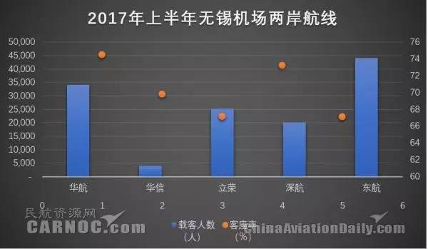 从2017年上半年主要机场两岸航线的表现观察,上海仍在两岸航线上扮演重要角色,北京、广州、深圳、厦门、福州等传统台商聚集地的客运量与客座率仍保持在较高水平。值得关注的是,无锡、宁波的两岸航线客座率在客运量较大的机场中排名较低,无锡机场共有5家公司运营两岸航线,竞争可谓激烈,市场需求减少后,各公司客座率均不理想。宁波机场情况类似,4家公司运营两岸航线,其中华信、长荣、立荣3家航空公司客座率低于70%。