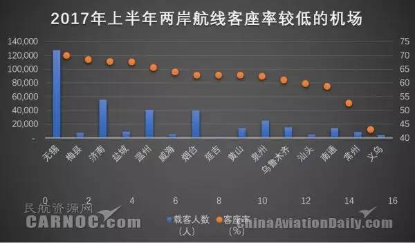 2017年上半年两岸航线客座率低于70%的机场共计15个。其中义乌机场客座率低于50%。延吉机场在各机场中两岸航线客运量最少。