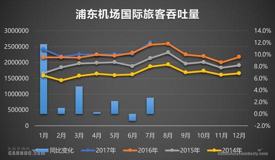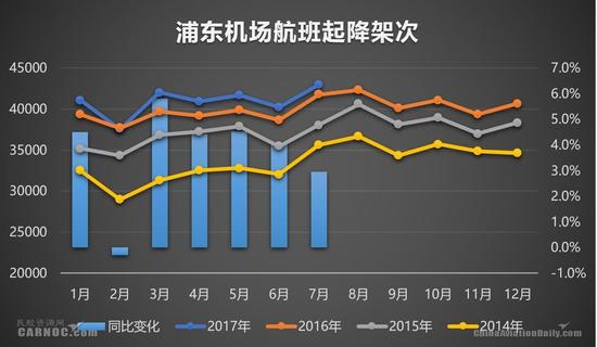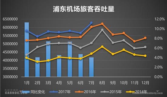 2017年上半年,浦东机场延续2016年正常性排名靠后的表现,多个月份受到民航局处罚,民航局在多份《关于落实航班正常管理措施有关情况的通告》提及,停止受理浦东机场客运加班、包机和新增航线航班申请。在最新一份通告中,民航局的通告显示“浦东机场6月数据已达标,但因2-5月份连续四个月数据不达标,自7月25日起至12月31日停止受理其客运加班、包机和新增航线航班申请。”2017年浦东机场航班起降架次增速也明显不及以往。此外,民航局也把航班正常性作为考虑增加机场高峰时刻容量评估的参考依据,这也意味着浦东机场业务量短期内难有明显增长的机会。浦东机场上次获批容量调整还是在2014年6月,2014年7月1日浦东机场的高峰小时容量标准调整为74架次。民航局时刻资源市场配置改革后浦东机场部分时段高峰小时航班架次已达到76架次/小时。
