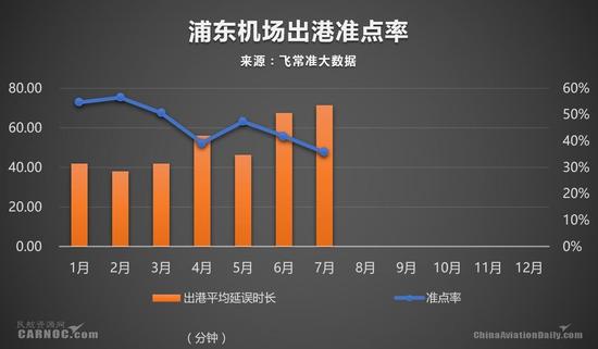 浦东机场半年报信息显示,2017年上半年浦东机场航班放行正常率为63.16%。飞常准大数据的浦东机场出港准点率及平均延误时长显示,浦东机场在多个月份出港准点率低于50%。出港平均延误时长超过40分钟。