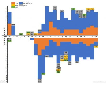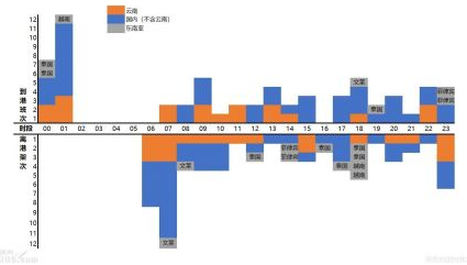 根据以上思路,基于飞常准大数据昆明机场2018年2月1日的航班运力安排,绘制昆明机场一天的航班波示意图,需要注意的是,由于部分航点的频次较低,可能不到每天1班,绘制航班波时,航班信息会缺失,但是不会影响对航班波整体结构的分析。