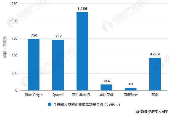 根据布莱斯太空与技术咨询公司(Bryce Space & Technology)统计数据,2018年全球航天初创企业融资金额总计约32亿美元,运载火箭企业融资金额较大,其中Blue Origin的7.5亿美元为单笔最大融资额,SpaceX合计融资7.37亿美元;我国星际荣耀与蓝箭航天在非美国地区初创企业中融资额排名靠前。2000-2018年,全球航天初创企业累计融资达到217.8亿美元。